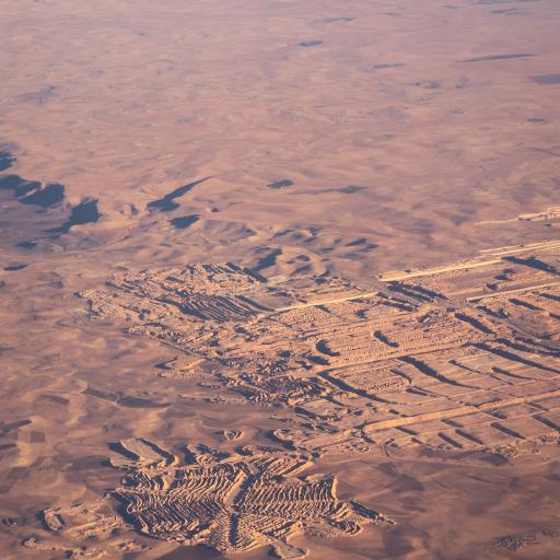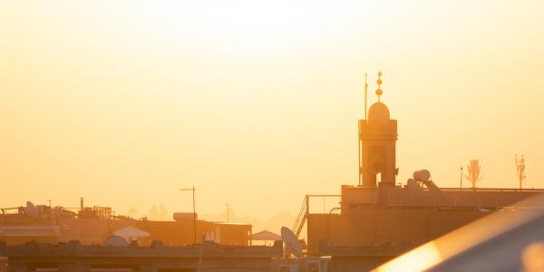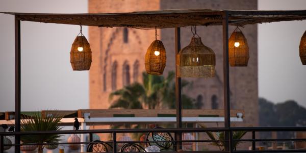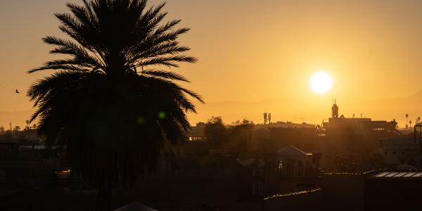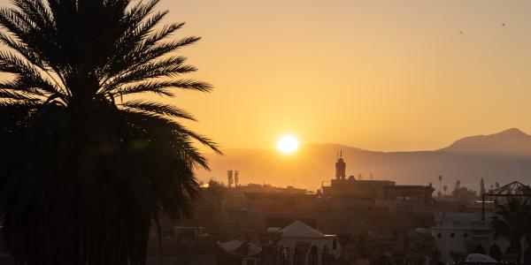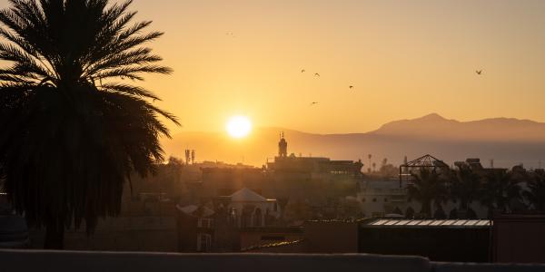 At dawn, the city glows in warm red light, with the Atlas Mountains silhouetted in the distance.